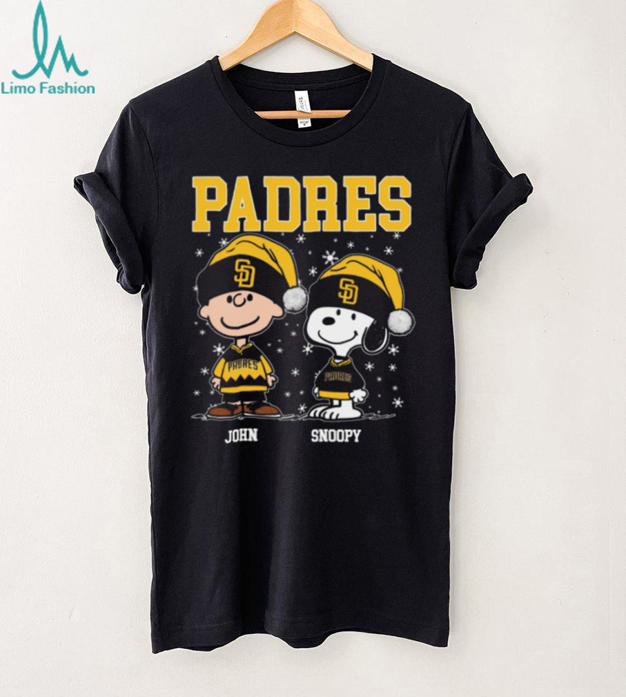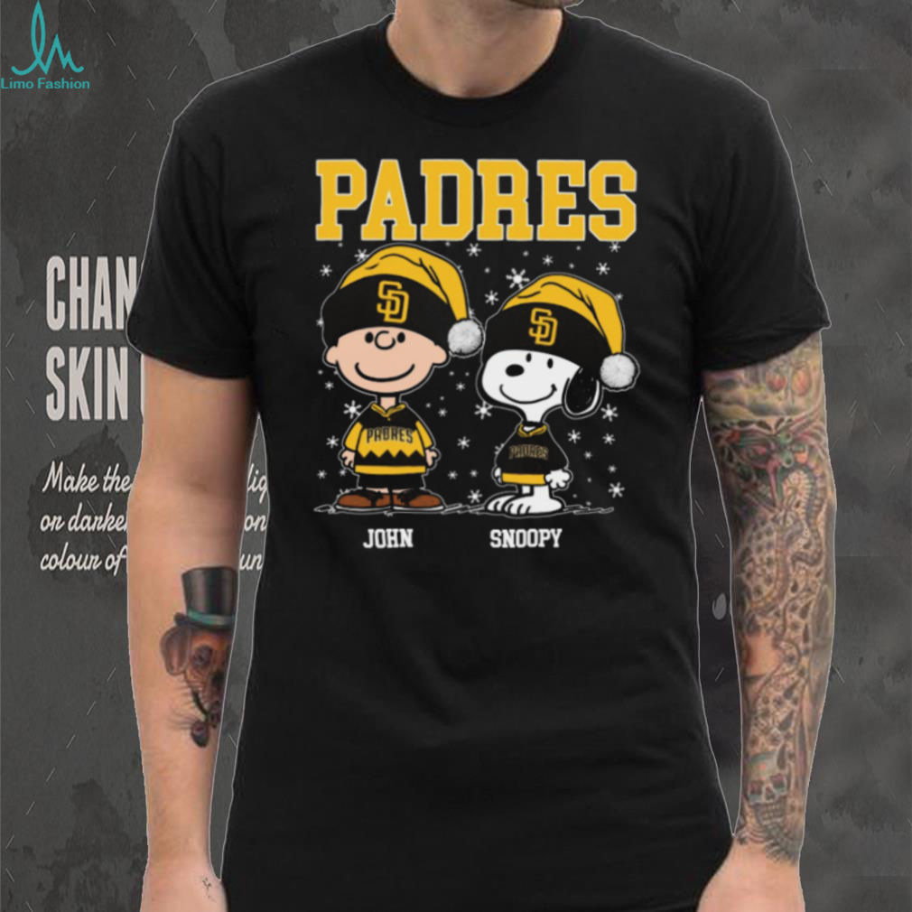 Personalized San Diego Padres Christmas Tee, Snoopy Charlie Brown Holiday Baseball Shirt with Santa Hat, Funny MLB Fan Gift Idea