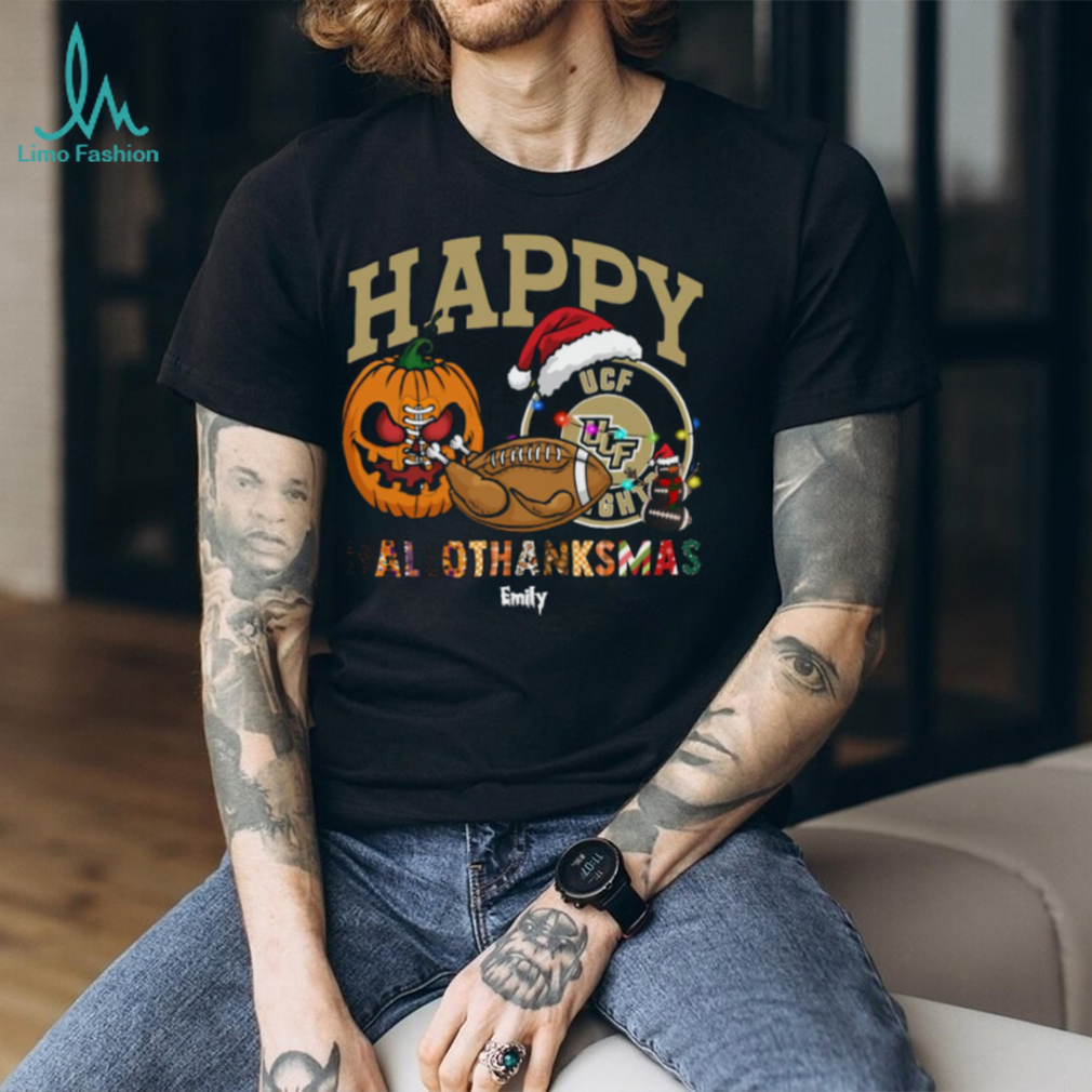 Personalized UCF Knights HalloThanksMas Tee, Funny Holiday Shirt with Pumpkin Football Santa Hat, NCAA Gift for Halloween Thanksgiving Christmas