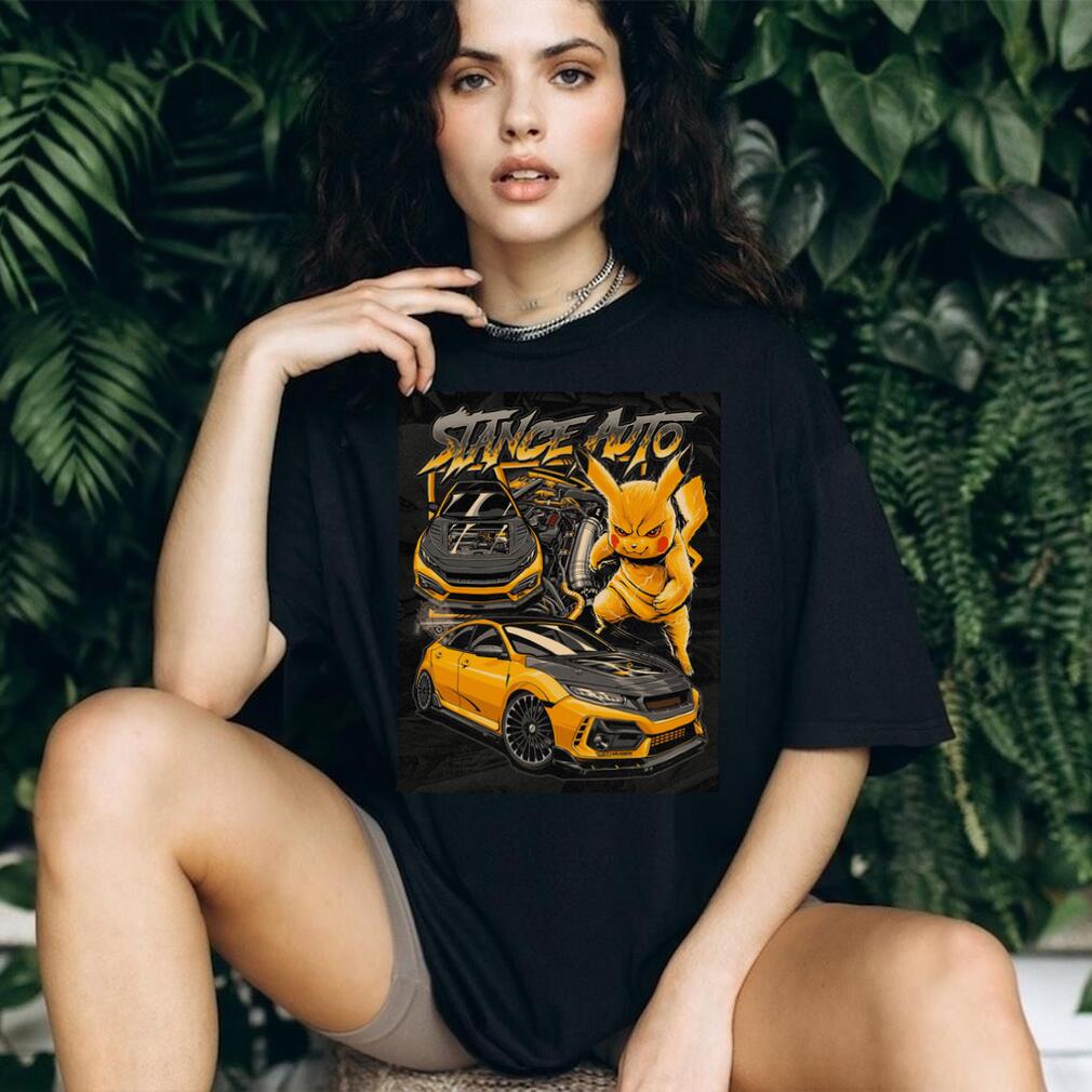 Ever feel like your style is stuck in neutral? This Pikachu Stance Auto Civic shirt is the perfect way to inject some high-octane energy into your wardrobe. It’s not just a shirt; it’s a statement that screams “I love cars, I love anime, and I’m not afraid to show it.” For those who live life a quarter mile at a time and appreciate a good Thunder Stone evolution, this tee is your new go-to.