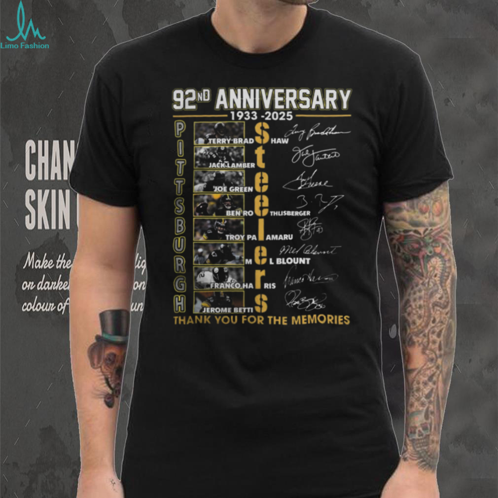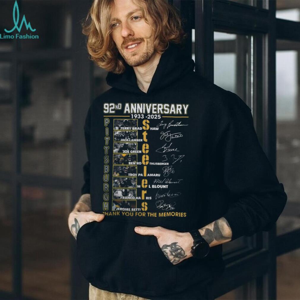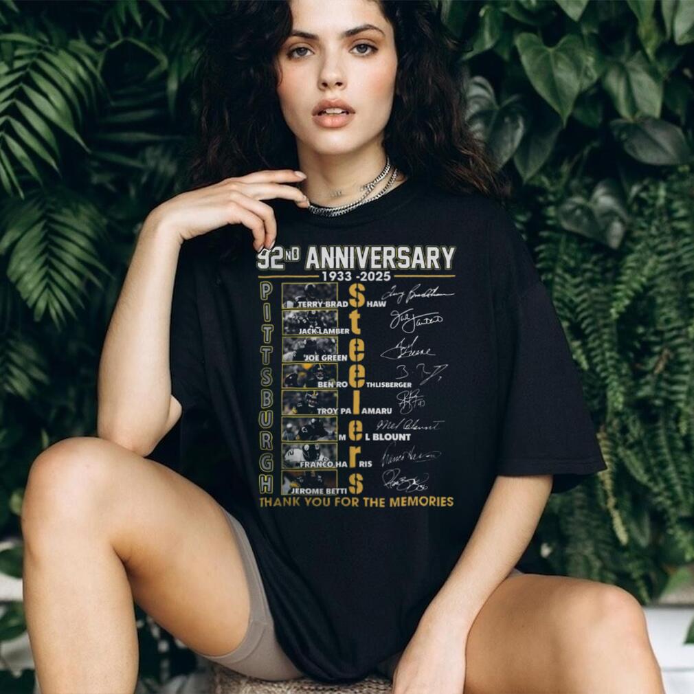 Relive nearly a century of Steelers greatness with this Pittsburgh Steelers 92nd Anniversary Thank You For The Memories T Shirt. As the Steelers approach their 100th year, show your appreciation for all the memories with this T-shirt. Perfect for die-hard fans, this unique design commemorates 92 years of touchdowns, championships, and unforgettable moments.