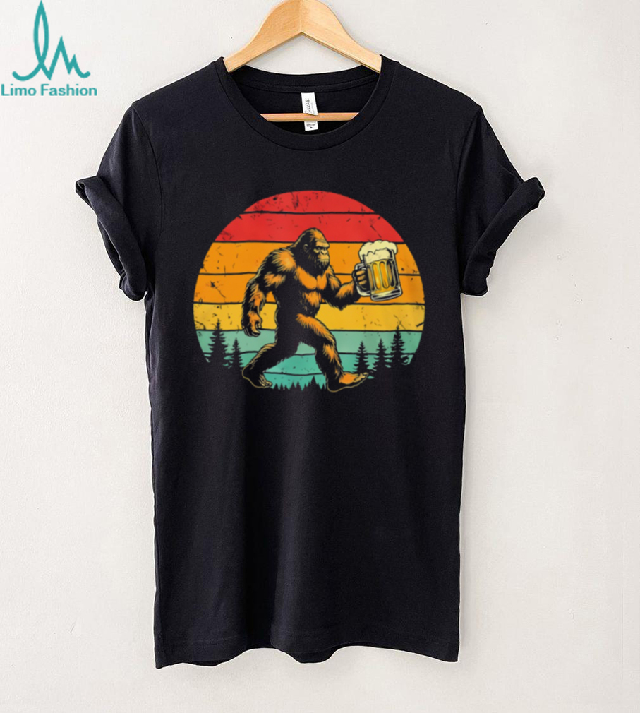 (Retro Bigfoot Carrying Beer Mug Sunset Forest Silhouette T Shirt)Retro Bigfoot Carrying Beer Mug Sunset Forest Silhouette T Shirt, Treat yourself or make a great gift for your loved ones