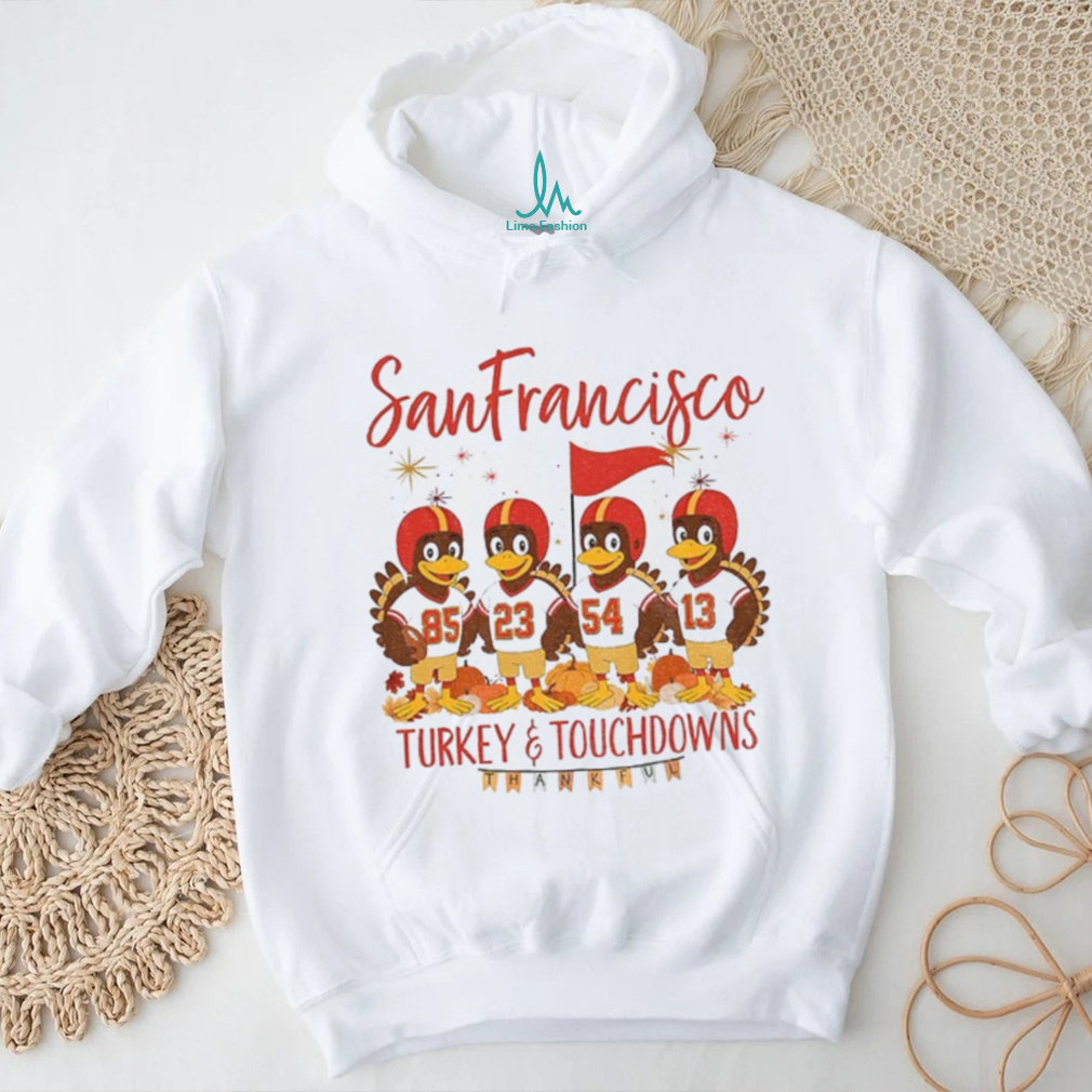 This San Francisco 49ers shirt isn’t just another piece of fan gear; it’s a perfect blend of team spirit and Thanksgiving cheer. Featuring a festive design with football imagery and a nod to turkey and touchdowns, it’s the ultimate way to celebrate both your team and the holiday. Made with a soft and breathable cotton blend, this shirt ensures comfort whether you’re at the stadium, watching from home, or enjoying Thanksgiving dinner. It’s a great way to show your 49ers pride and express your Thanksgiving spirit. Available in a range of sizes, it’s designed for every fan.