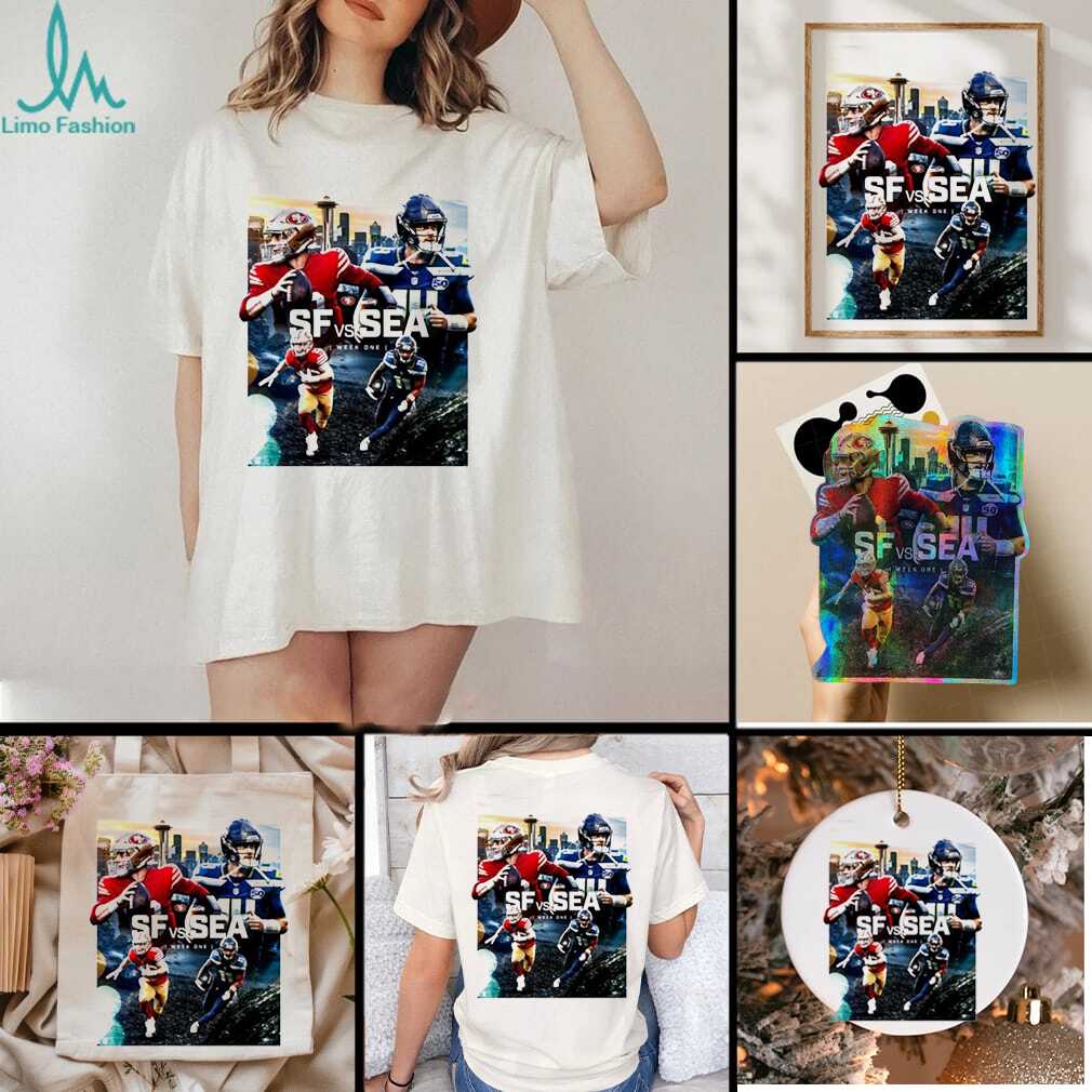 Get ready for the gridiron clash with this unique Seattle Seahawks and San Francisco 49ers Week 1 matchup graphic shirt! Imagine the excitement of the season opener, the rivalry renewed, and the energy of the crowd. This shirt captures the essence of the game, blending team spirit with a memorable graphic design. A must-have for die-hard NFL fans who want to showcase their passion in style.