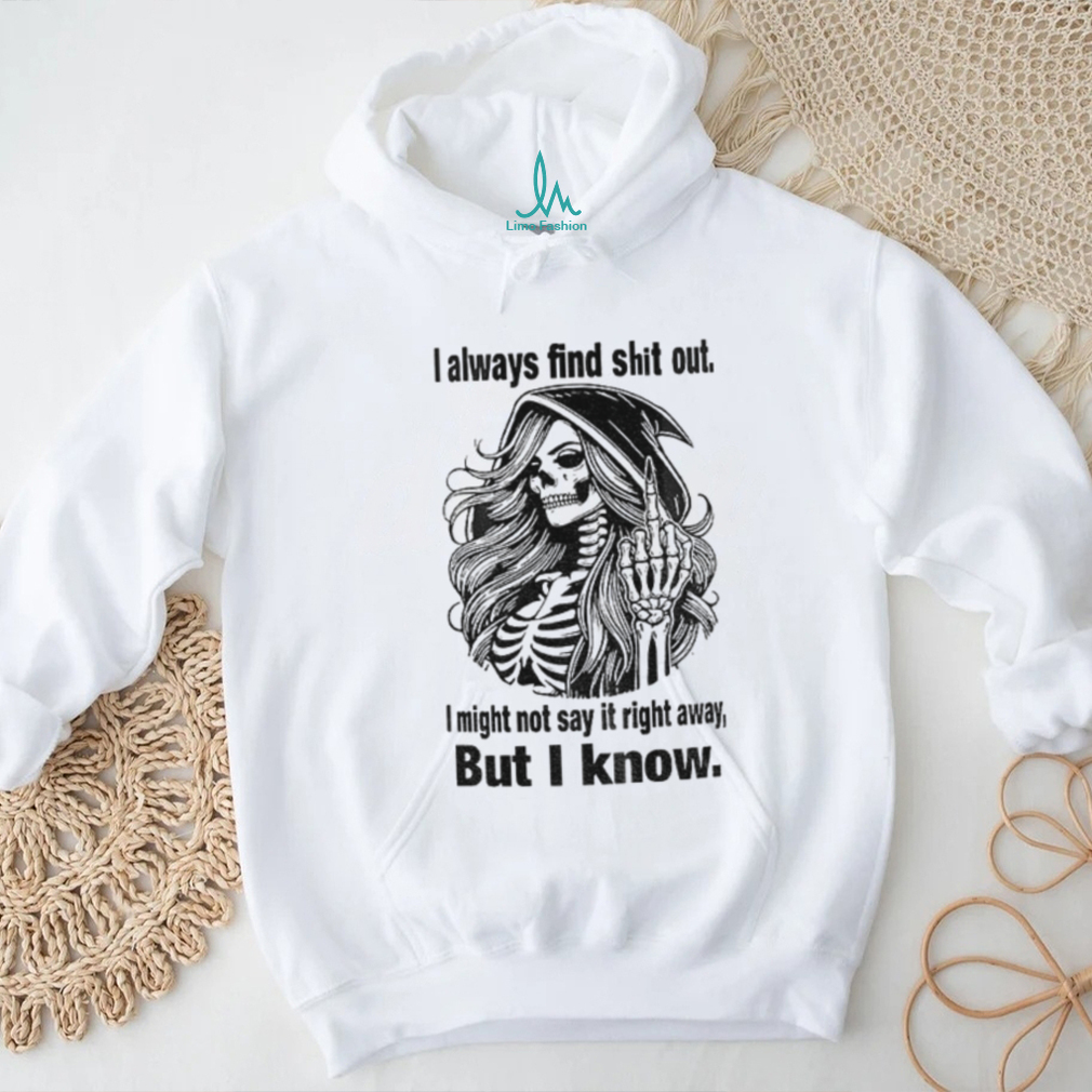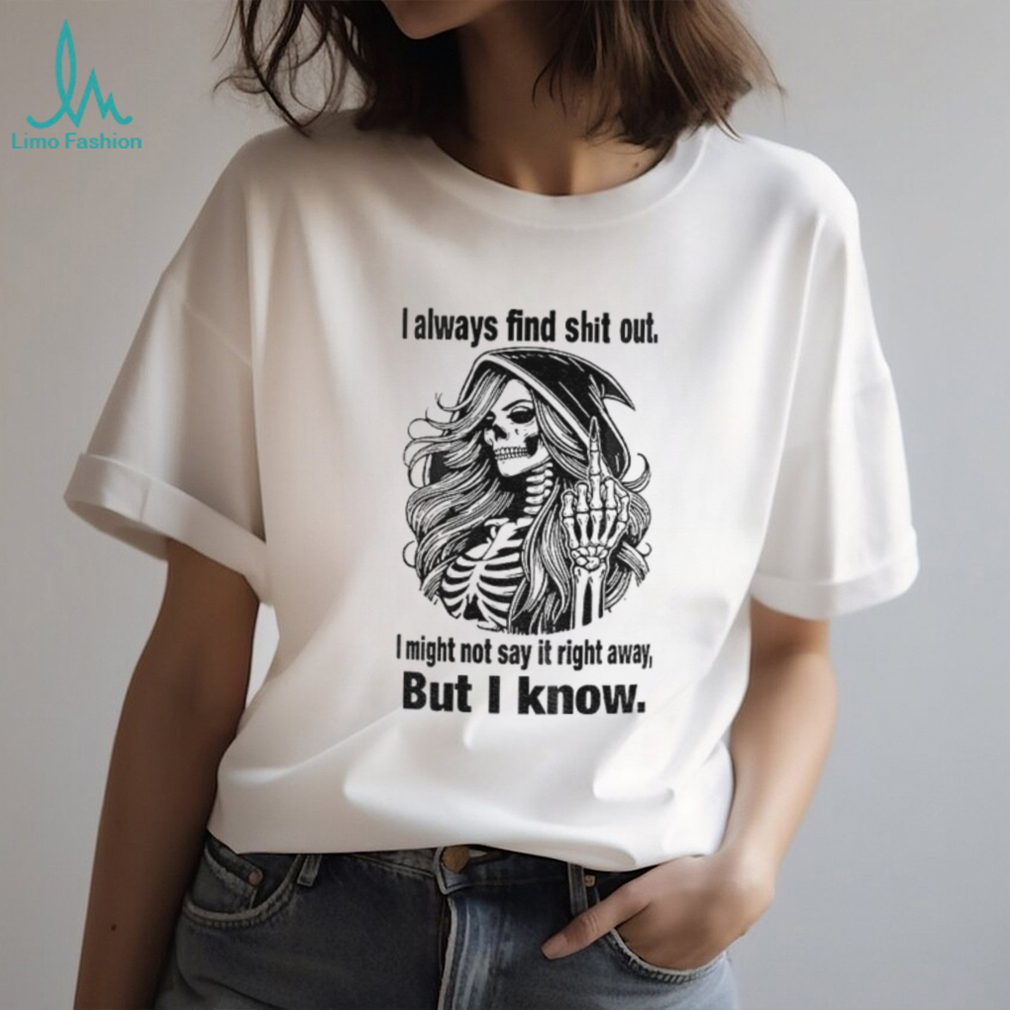 The Skull I always find shit out I might not say it right away but I know shirt is perfect for individuals who are naturally intuitive, perceptive, and have a good sense of humor about their “all-knowing” tendencies. It’s great for casual gatherings, social events, or just as an everyday tee that expresses your unique personality. This shirt also makes an excellent and amusing gift for that friend, family member, or colleague who constantly surprises everyone with how much they truly know, even when they act like they don’t.