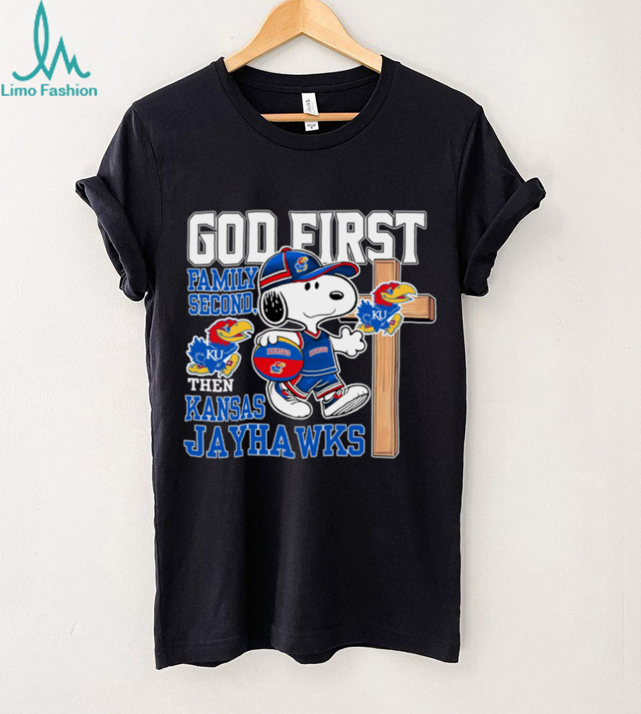 Show your priorities and your team spirit with this unique t-shirt! Imagine cheering on the Kansas Jayhawks, while also declaring your faith and love for family. This Snoopy t-shirt captures that special blend, making it the perfect addition to any game day or casual wardrobe.