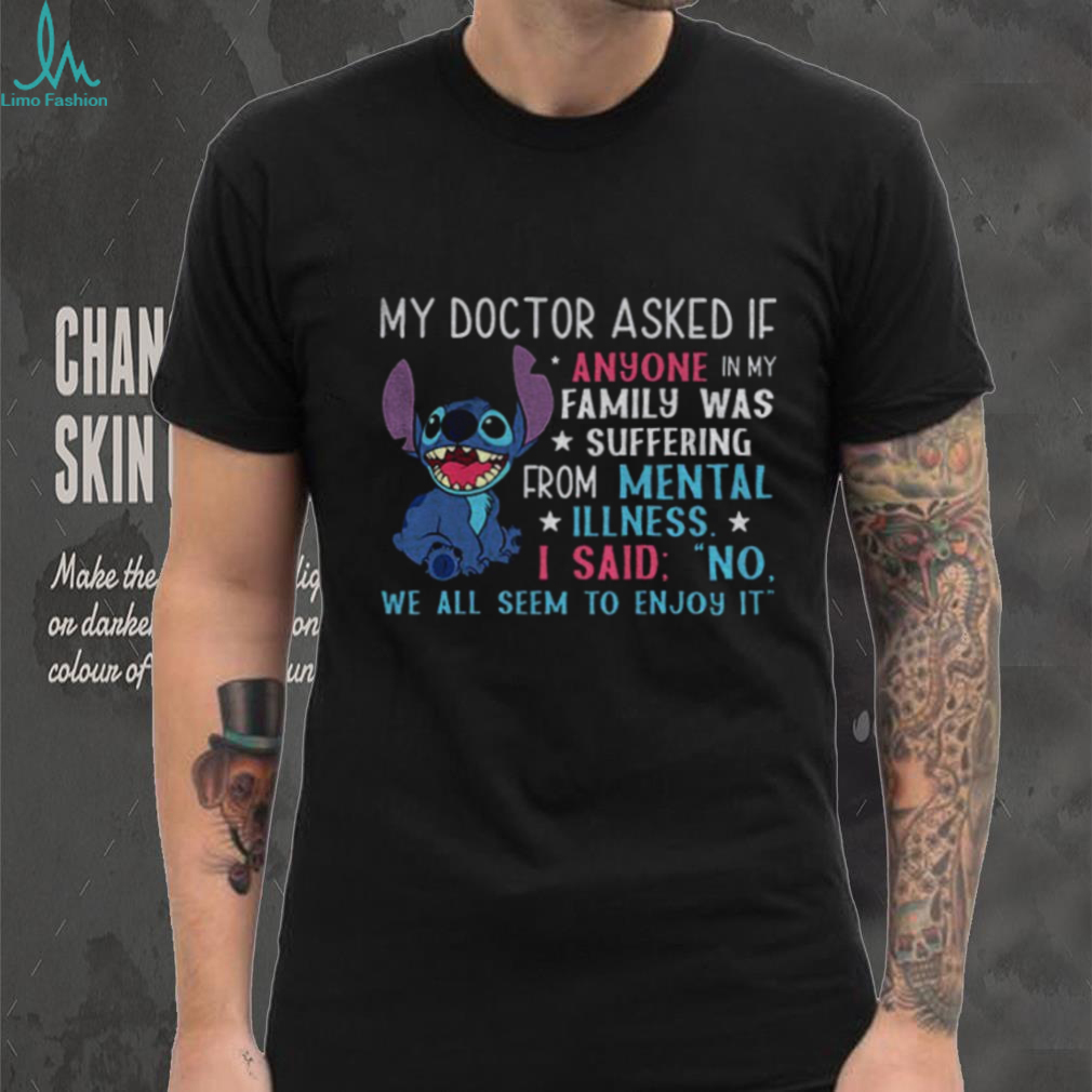 This “Stitch my doctor asked if anyone in my family was suffering from mental illness shirt” is ideal for Stitch enthusiasts, those with a dry sense of humor, or anyone looking for a witty way to represent mental health conversations. It’s a thoughtful gift for a friend or family member who appreciates a good laugh and a touch of relatable sarcasm. Wear it to casual gatherings, while running errands, or simply as a comfortable, expressive piece at home.