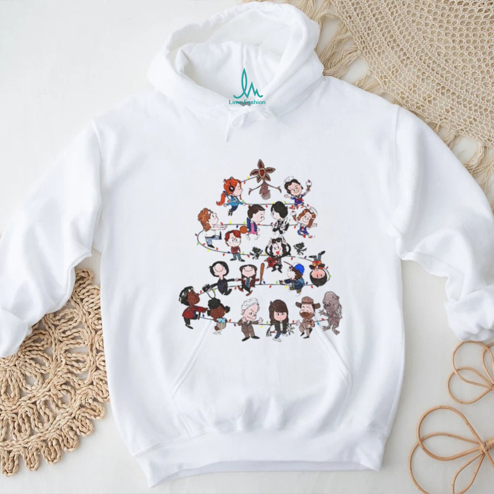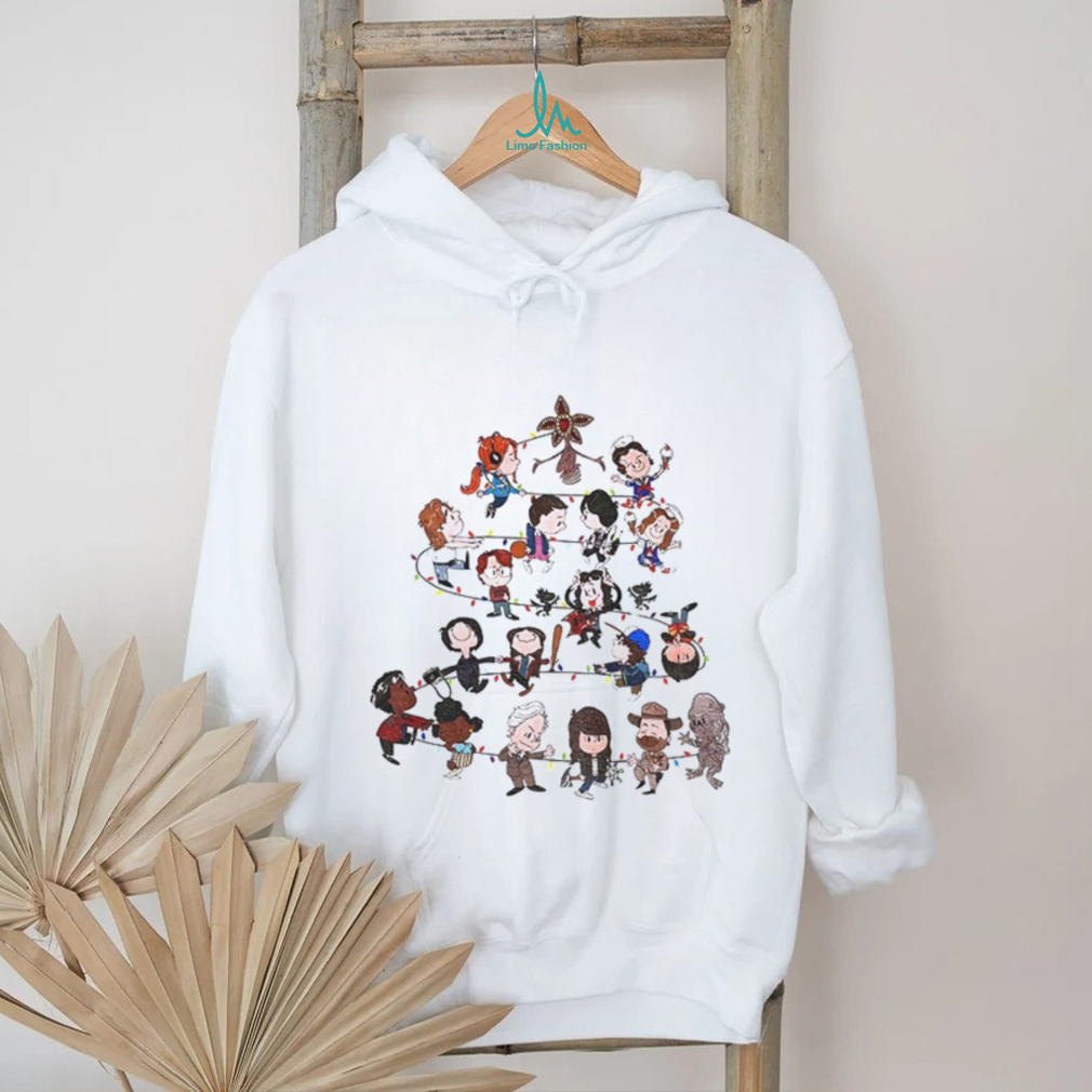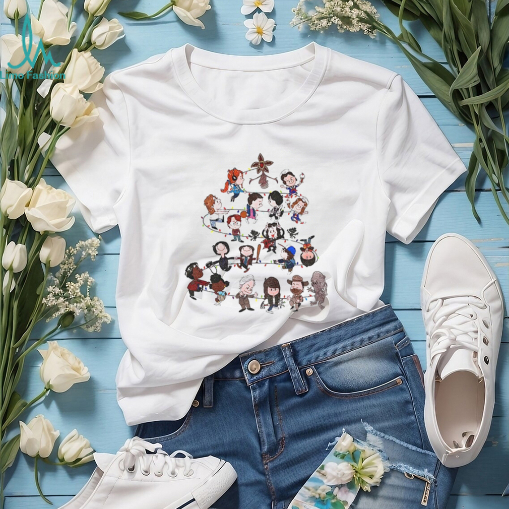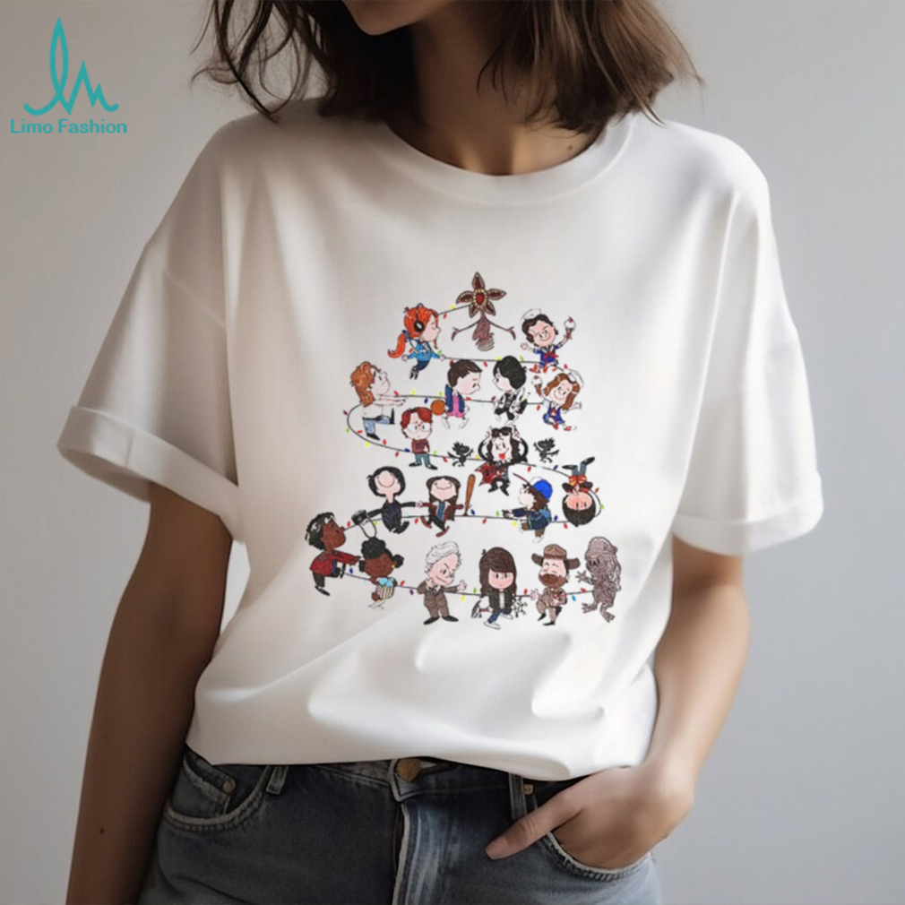 Combine your love for “Stranger Things” with the holiday spirit with this unique Christmas T-shirt! Featuring your favorite characters in a fun, cartoon style, arranged as a Christmas tree, this tee is the perfect way to celebrate the holidays in the Upside Down.