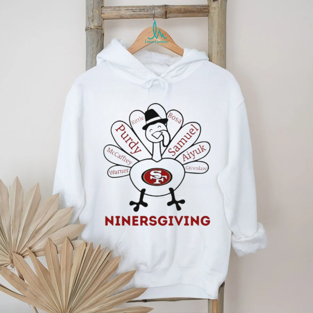 This unique San Francisco 49ers Thanksgiving shirt blends the festive joy of Thanksgiving with the excitement of NFL football. Featuring your cherished 49ers heroes in a fun, holiday-themed design, it’s a standout piece for any fan. Made from a soft, comfortable cotton blend, this shirt is perfect for enjoying a hearty meal or cheering on the Niners. Its durable print and classic fit make it a reliable choice for game days and family gatherings, ensuring your team spirit shines brightly.