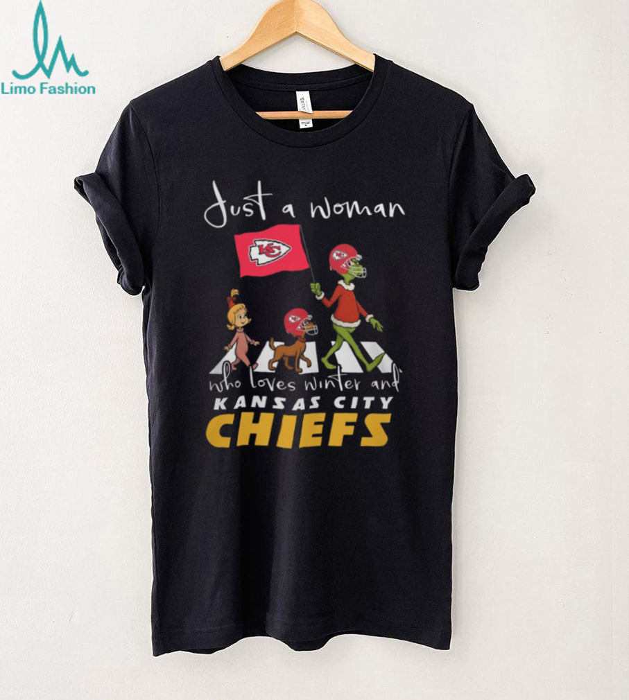 With each The Grinch Just A Woman Who Loves Winter And Kansas City Chiefs Christmas Road Abbey T shirts, you are contributing to creating a green tree. To keep your shirt looking its best, machine wash cold, inside out, and tumble dry low. Avoid ironing directly on the print to preserve the playful design for years of festive fun!