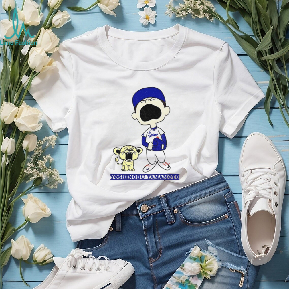 Celebrate the arrival of Yoshinobu Yamamoto with a touch of Peanuts charm! This unique shirt features Yamamoto as Charlie Brown in a Los Angeles Dodgers uniform, blending MLB excitement with classic cartoon fun. Perfect for Dodgers fans with a sense of humor.